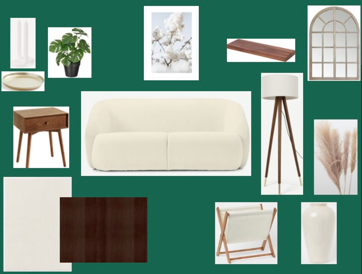 Candle sticks - made.com / Gold tray - Primark / Faux plant - Ikea / Floral poster - Desenio / Rustic Mirror - Woodies / Floor lamp - made.com / Pampas grass - Pinterest / Vase - Made.com / Magazine rack - H&M / White Rug - H&M / Wooden side table - Made.com / Sofa - made.com